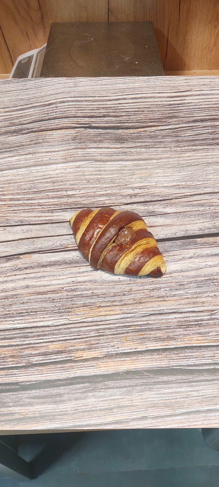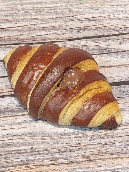 Unser feines Buttercroissant mit Kakaoschicht im Teig und mit reichlich echter Nutella gefüllt.