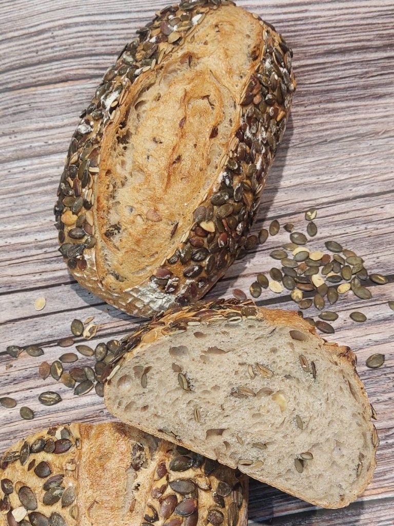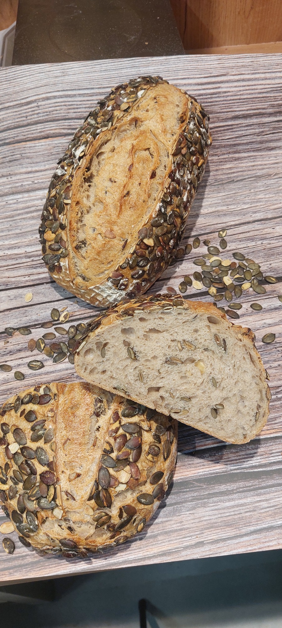Entdecke den unverwechselbaren Geschmack unseres Kürbiskernbrots - ein rustikales Meisterwerk mit gerösteten Kürbiskernen und feinem Kürbiskernöl. Außen goldbraun und knusprig, innen saftig und nussig - jedes Stück ist eine Hommage an ehrliches Handwerk und bestem Geschmack.