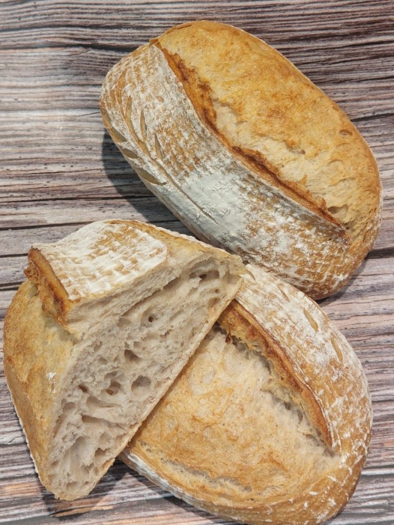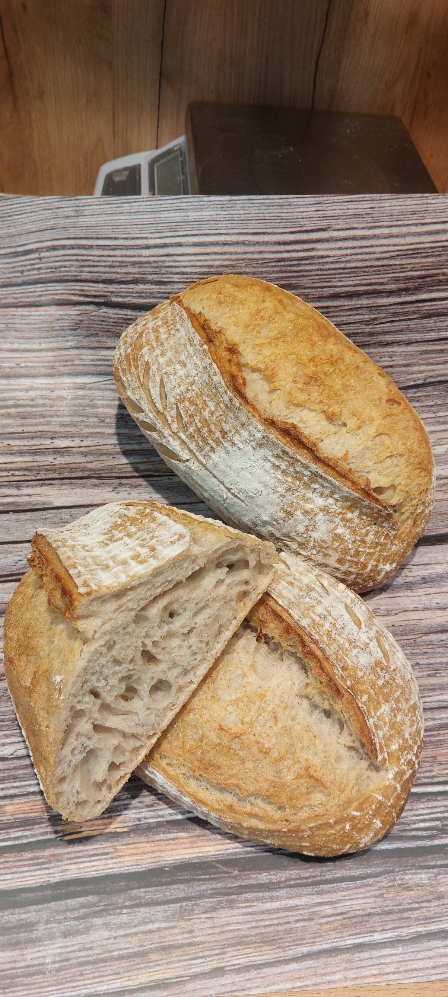 ohne Hefe, nur mit natürlichem Sauerteig gelockert. Hergestellt aus regionalem Mehl und von Hand geformt, ruht es lange, um sein einzigartiges Aroma und seine perfekte Kruste zu entfalten.